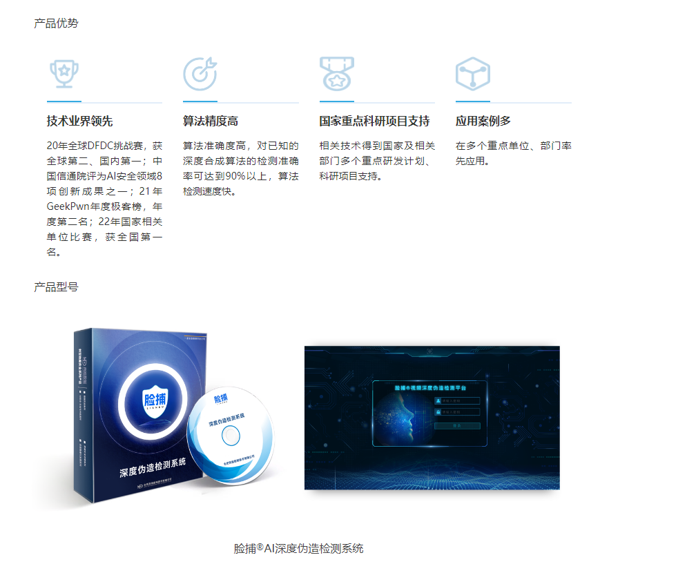 系統(tǒng)基于自主研發(fā)、國際領(lǐng)先的多注意力機制引導(dǎo)的多維度人臉偽造檢測框架,實現(xiàn)對人臉深度偽造技術(shù)生成內(nèi)容的精準(zhǔn)檢測,可應(yīng)對深度偽造技術(shù)在認知域?qū)?、輿論引?dǎo)、商業(yè)欺詐等方向上對國防安全、社會安全和經(jīng)濟安全的重大安全風(fēng)險。
